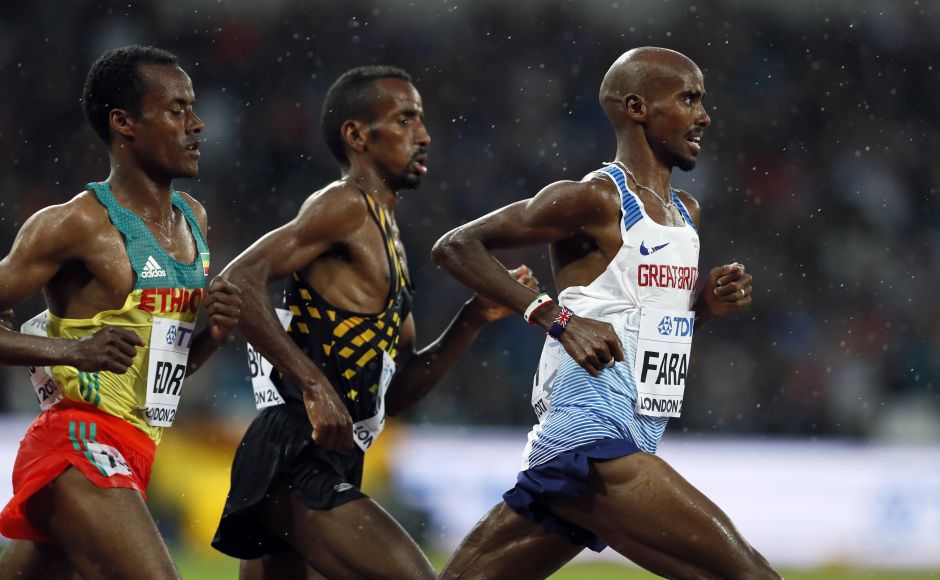 In relentless rain, Mo Farah ran a controlled race and coasted home in second place to automatically qualify for the 5000m final behind Yomif Kejelcha of Ethiopia. The Briton is seen here making his famous Mobot gesure. AP
