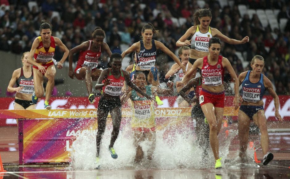 Athletes clear the water jump in a women’s 3000-metre steeplechase first round heat during the IAAF World Championships in London. AP