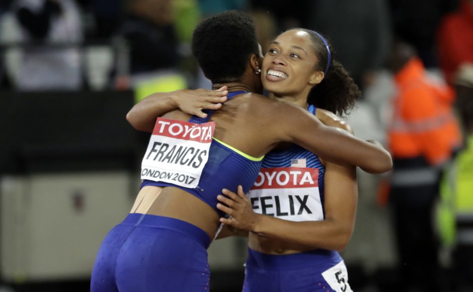 Women’s 400m bronze medal winner Allyson Felix (R) embraces gold medal winner Phyllis Francis (L) after the final. Despite her disappointing third-place finish, Felix’s bronze gave her a 14th career medal at the world championships. AP
