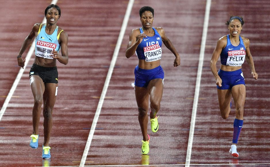 American Phyllis Francis (centre) leads the field to win the women’s 400 metres final. Francis upset favourites, Olympic champion Shaunae Miller-Uibo (L) of Bahamas and compatriot Allyson Felix (R) to win the title at IAAFWorld Championships in London. AP