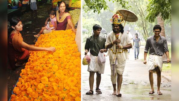 (L) Whether at home or not, the fervour never dies: women at Chennai’s main flower market on the eve of Onam. Bulk of the flowers consumed by Kerala during the Onam season are from Tamil Nadu. (R)Onam celebrates the imaginary return of an Asura King Maveli, who once ruled Kerala as the perfect socialist state. In this image, a Maveli roams the streets. Firstpost