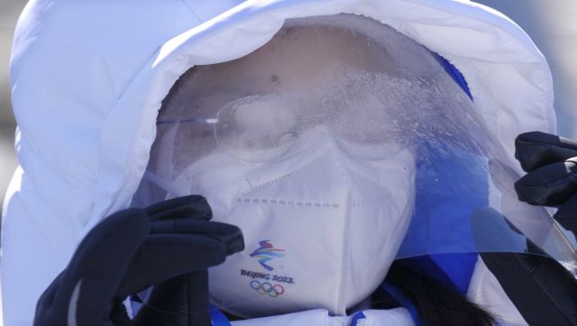 A volunteer lifts her frost covered mask at the National Biathlon Center during a practice session for the 2022 Winter Olympics. AP