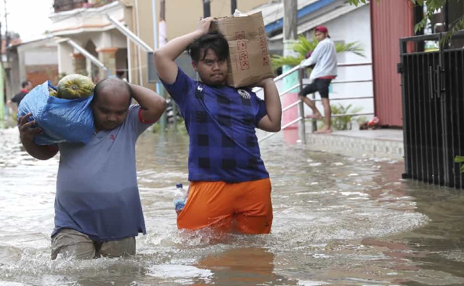 Residents wade through a flooded neighborhood in Tanggerang on the outskirts of Jakarta. Video and photos showed cars floating in muddy waters while soldiers and rescuers in rubber boats helped children and elders forced onto the roofs of flooded homes. The floods inundated thousands of homes and buildings in poor and wealthy districts alike, have forced authorities to cut off electricity and water and paralysed transport networks, said National Disaster Mitigation Agency spokesman Agus Wibowo. AP
