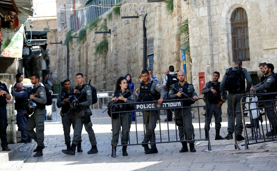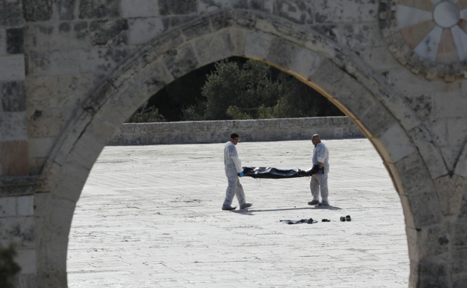 Israeli policemen carry the body of an assailant after he was shot dead by Israeli police. Israeli authorities shut the area to Muslims who had gathered for Friday prayers, drawing a call for resistance from Palestinian religious leaders. Reuters