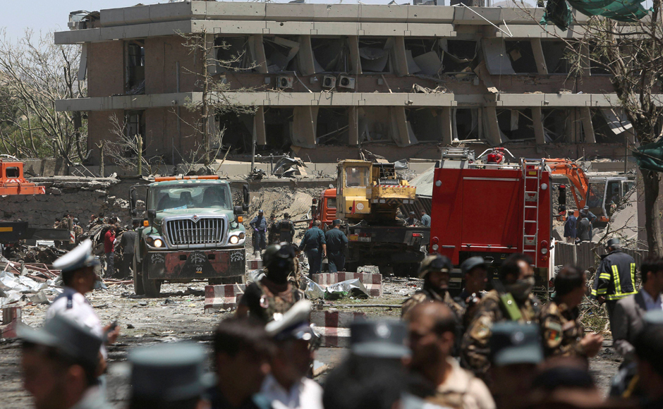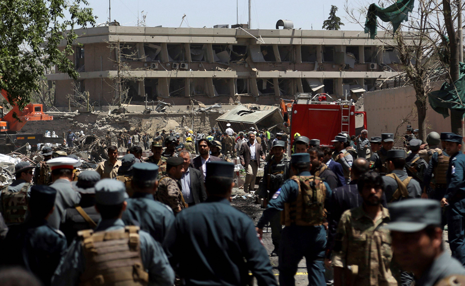 Bodies littered the scene and a towering plume of smoke rose from the area, which houses foreign embassies. Security forces are seen in front of the German Embassy after the suicide car bombing in Kabul. AP