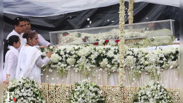 Bollywood superstar Amitabh Bachchan, center and his son actor Abhishek Bachchan at the funeral. Sachin Gokhale/Firstpost