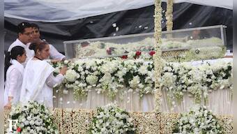 Bollywood superstar Amitabh Bachchan, center and his son actor Abhishek Bachchan at the funeral. Sachin Gokhale/Firstpost
