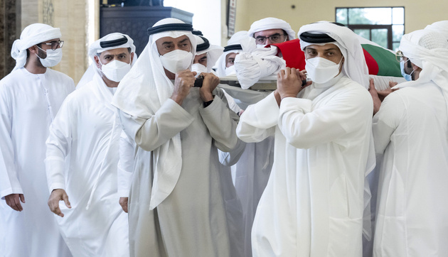 Sheikh Mohamed bin Zayed Al Nahyan, ruler of Abu Dhabi, front left, and Sheikh Mansour bin Zayed Al Nahyan, UAE Deputy Prime Minister and Minister of Presidential Affairs, front right, carry the body of Sheikh Khalifa bin Zayed Al Nahyan at Sheikh Sultan bin Zayed The First mosque, in Abu Dhabi, 13 May, 2022. AP