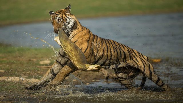 Shell I Eat You? This action shot captures a rarely-seen natural history moment, where the legendary Arrowhead of Ranthambhore fishes out an Indian Softshell Turtle from the lake for lunch. Image: Sankhesh Dedhia/Nature inFocus Photography Awards 2023