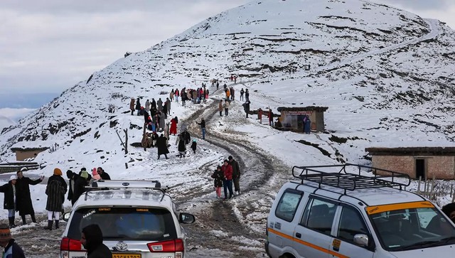 Tourist cars assembled in Kashmir’s Nathatop. Routes between Solang and Atal Tunnels have been closed due to heavy snowfall. PTI