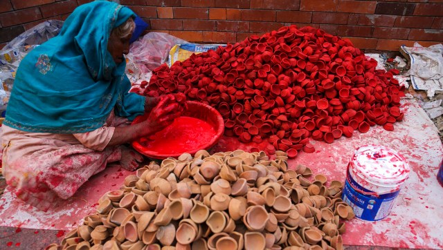 A woman colours earthen lamps ahead of Diwali in Jammu. Diwali is one of Hinduism’s most important festivals, dedicated to the worship of the goddess of wealth Lakshmi. AP