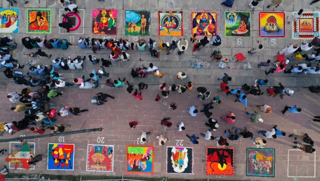 Rangolis depicting the life of Hindu God Rama was drawn on the banks of the Saryu river in Ayodhaya. Nine lakh earthen lamps or “diyas” by the Saryu riverbank to be illuminated on Deepotsav celebrations on the eve of Diwali. AP