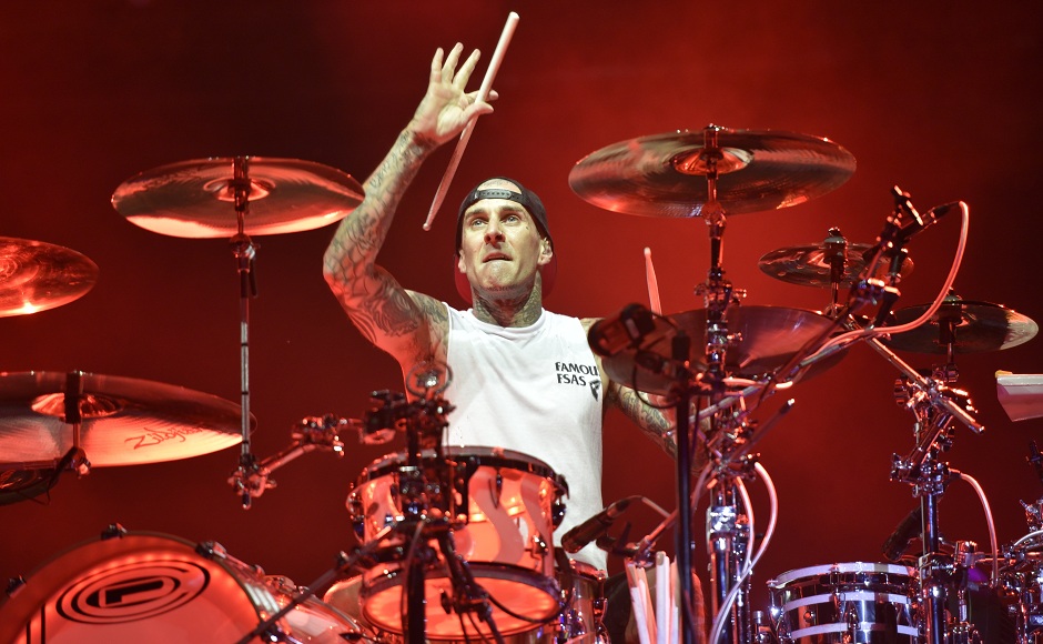 Travis Barker of Blink 182 drums it away at the Lollapalooza music fest in Chicago. Image from AP.