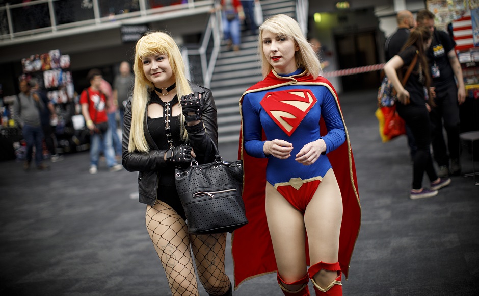 Two cosplayers dressed as Blackcat and Supergirl attend London Super Comic Convention at Business Design Centre in Islington, London on 26 August, 2017. AFP PHOTO