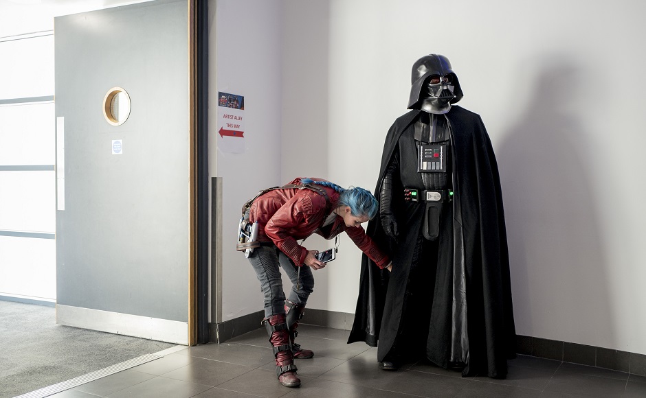 Cosplayers dressed as Peter Quill from Guardians of the Galaxy (L) and Darth Vader from Star Wars attend London Super Comic Convention. AFP PHOTO