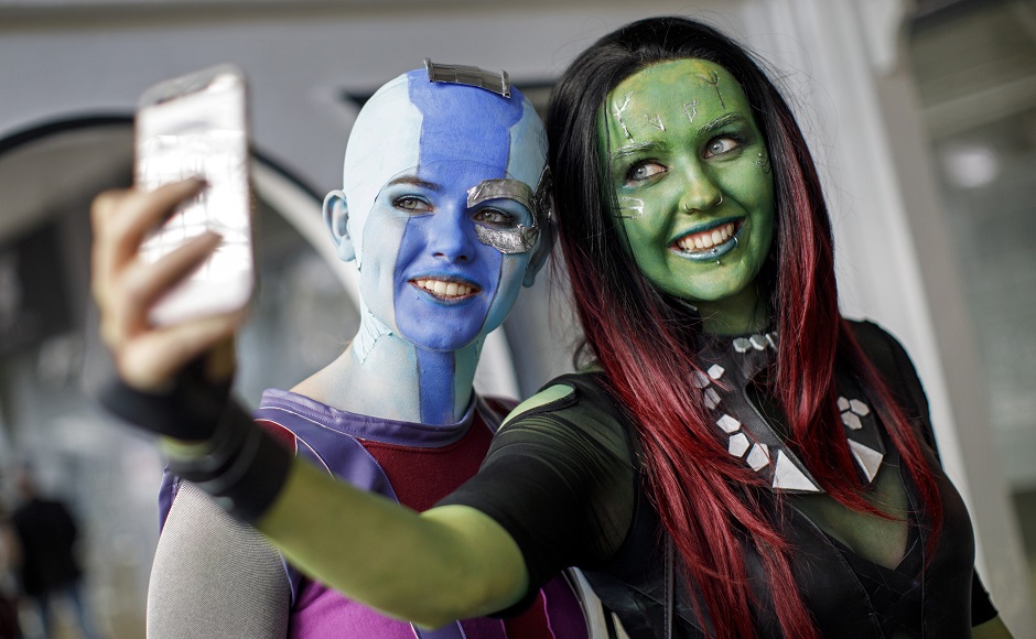 Cosplayers dressed as Nebula and Gamora from Guardians of the Galaxy pose for a selfie photograph as they attend London Super Comic Convention. AFP PHOTO