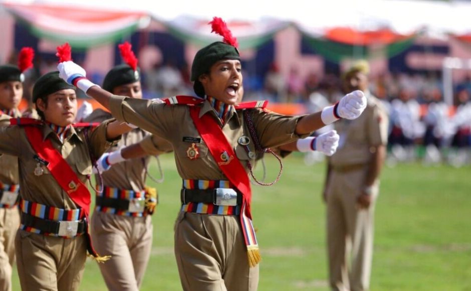 Members of the National Cadet Corps (NCC) marched during the celebrations in Jammu. AP