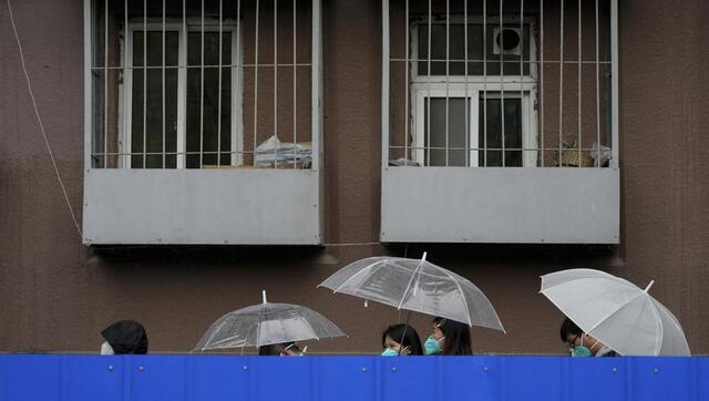 Residents holding umbrellas line up in the rain along the barricaded fence for COVID tests outside the locked-down apartment building on 27 April, 2022, in Beijing. AP