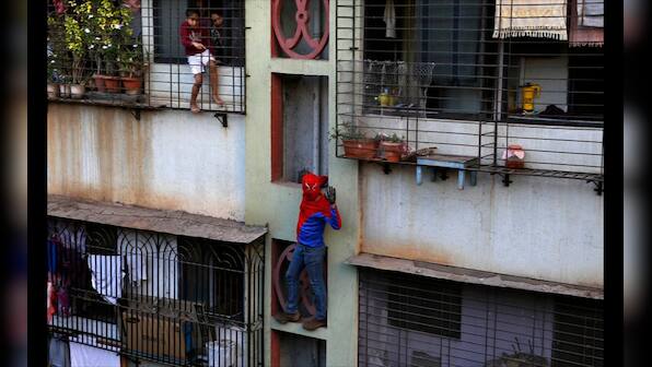 Spiderman drops off pamphlets at homes in Mumbai as part of his campaign. AFP PHOTO/ INDRANIL MUKHERJEE