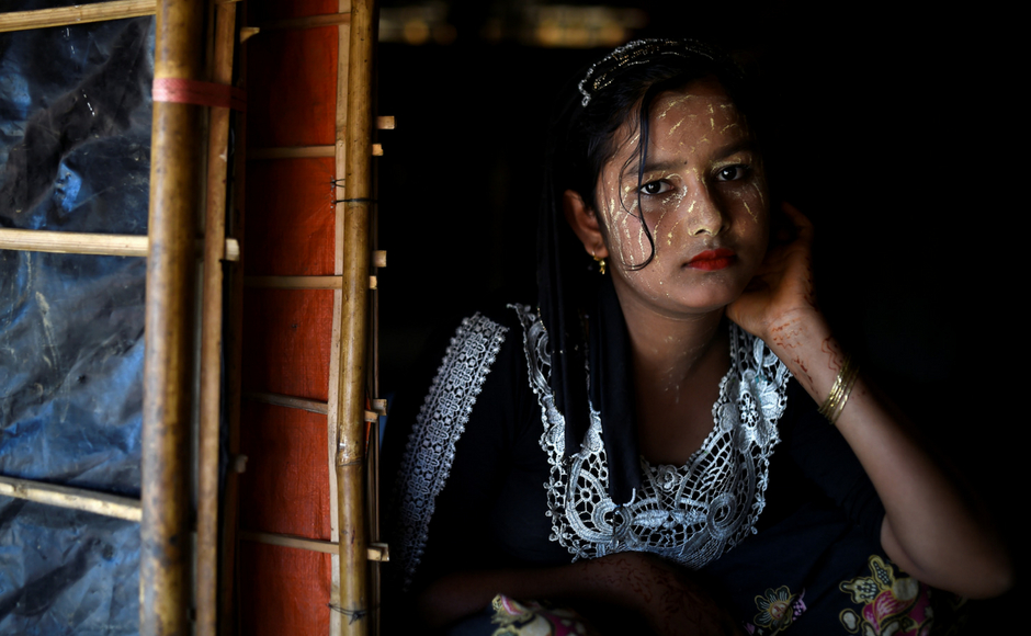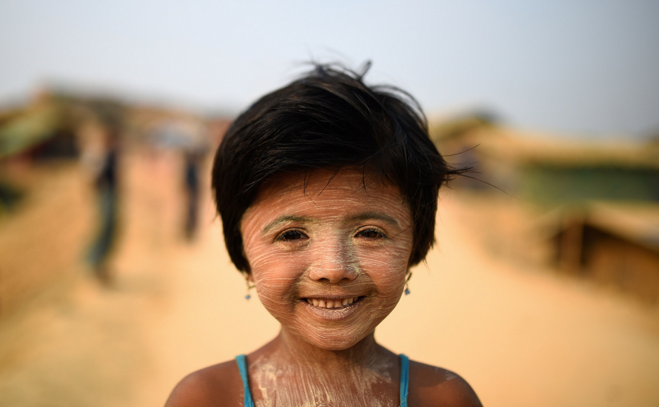 A 6-year-old Rohingya refugee girl, Nur Kayas, lathered in thanaka paste at the Kutupalong camp in Cox’s Bazaar, Bangladesh. The paste, made from the bark of the thanaka tree is sold in Cox Bazaar. Reuters/Clodagh Kilcoyne