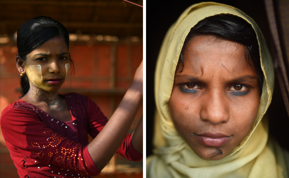 In Cox Bazaar of southern Bangladesh are Rohingya girls and women who decorate their cheeks with swirls of yellow paste made from ground thanaka tree bark