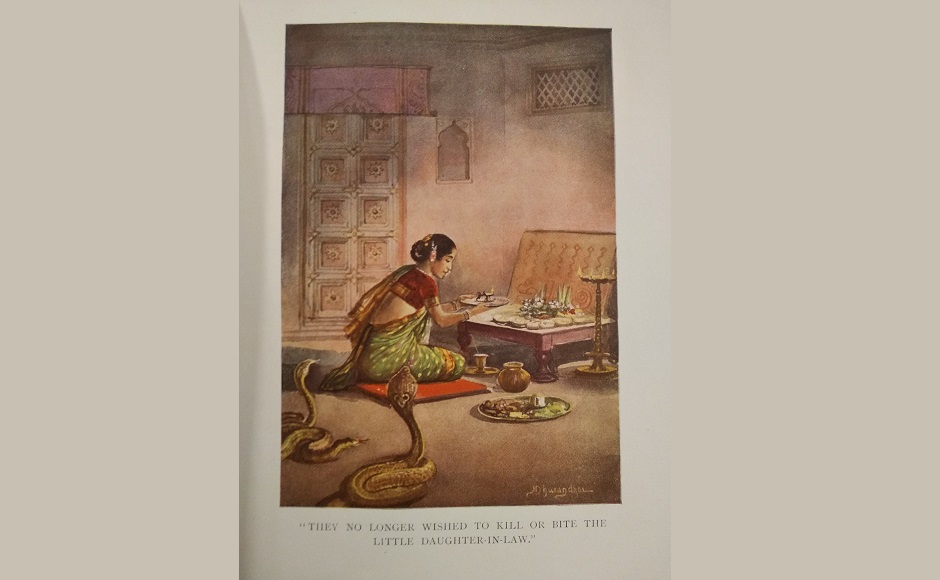 They no longer wished to kill or bite the little daughter-in-law is an illustration that appeared in the same book in the story, Nagoba, The Snake King. Dhurandhar was trained at Sir JJ School of Art in Mumbai and went on to become its headmaster. His works described as theatrical realism are read as testaments of that particular time in history.
