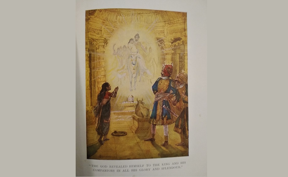 This illustration, The God revealed himself to the king and his companions in all his glory and splendour, appears in the story The Golden Temple. Dhurandhar was deeply rooted in traditional ideas in his personal life yet his works have been described as re-indigenized Indian naturalism in response to Western ideals.