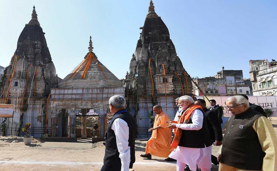He began his visit by praying at the Kashi Vishwanath Temple, where he laid the foundation stone for the beautification and strengthening of the approach road. Modi also inspected the project site. Twitter/@PIB_India