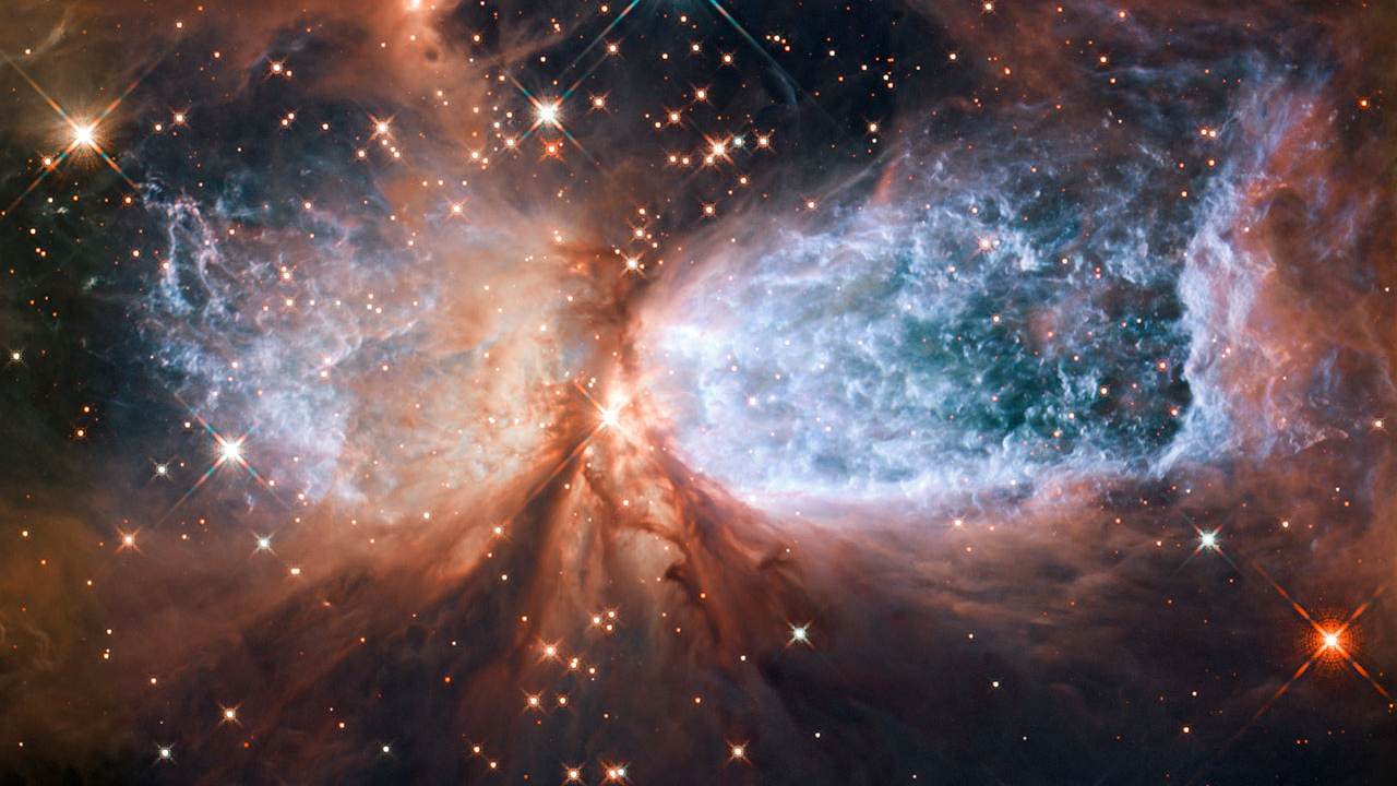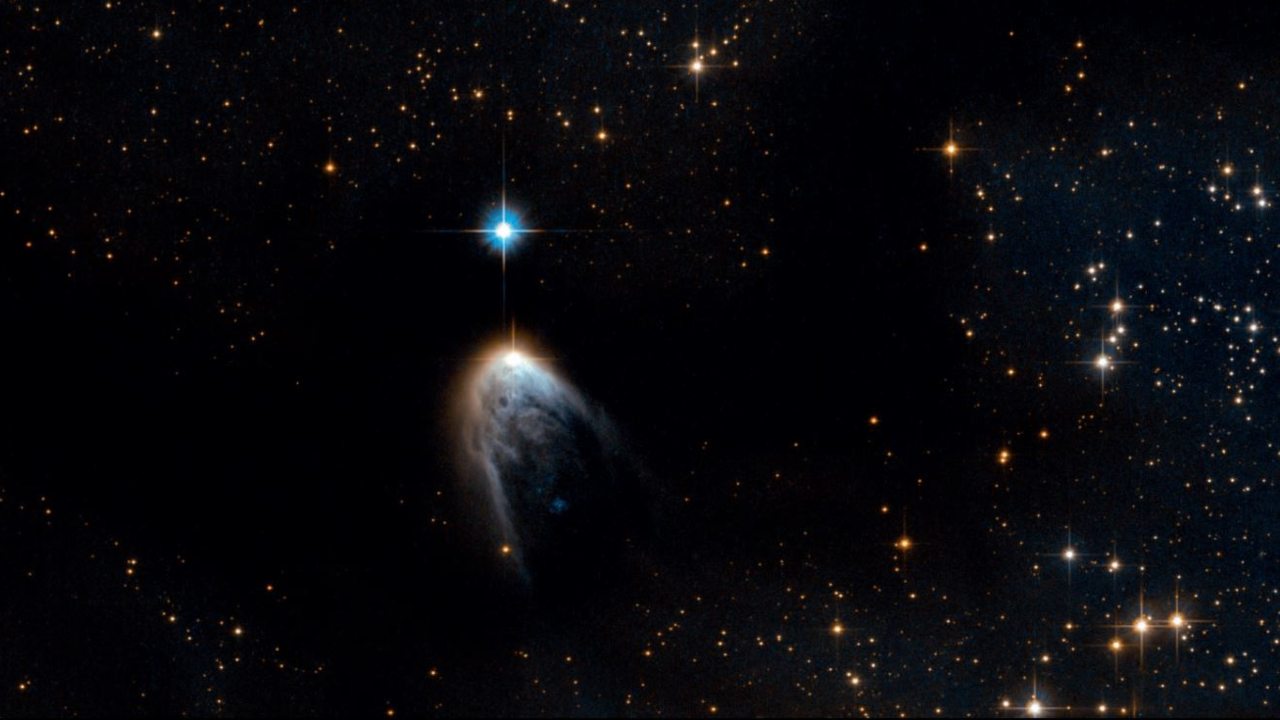 The 2011 composite image of Sh 2-106 shows a newly formed star at the centre that is shrouded in dust and gas. The glowing blue light is hydrogen gas. Image credit: ESA/Hubble