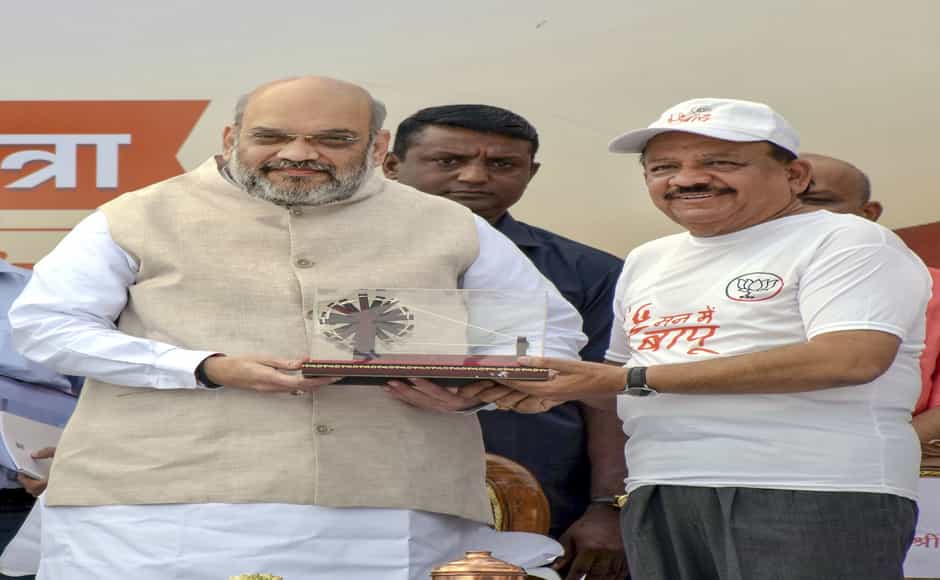 Union Home Minister Amit Shah and Union Health Minister Harsh Vardhan during the launch of BJP’s ‘Sankalp Yatra’ to propagate Gandhian ideology. The BJP will also use the massive event to spread awareness against plastic on Mahatma Gandhi’s 150th birth anniversary, in New Delhi. PTI