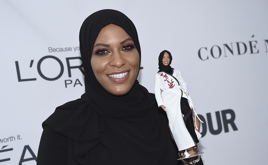 Ibtihaj Muhammad holds a Barbie doll in her likeness. Image from AP