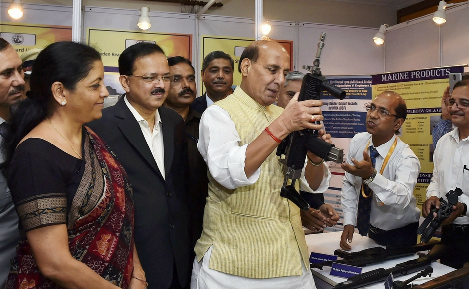 Nirmala Sitharaman took charge of the defence ministry on Thursday. She vowed to enhance India’s military preparedness and ensure the welfare of soldiers. Sitharaman and Rajnath Singh look at a mini UAV being displayed during a conference at DRDO Bhavan in New Delhi. PTI