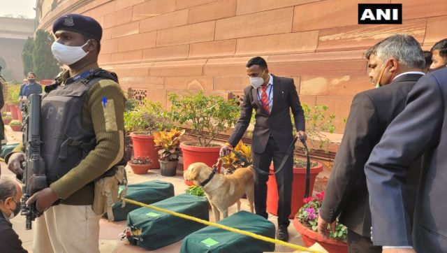 Security officials stand guard as the Budget papers reach Parliament. Image Courtesy: ANI/Twitter