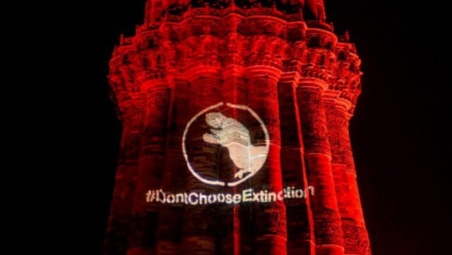 3D image of Frankie the Dino is projected on the illuminated Qutub Minar, the heritage minaret at the Qutub complex by the United Nations Development Programme (UNDP) India on the eve of World Environment Day in New Delhi on 4 June, 2022. AFP