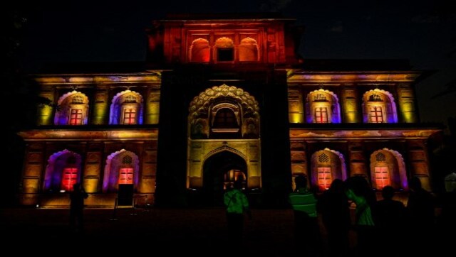 Visitors are silhouetted against the illuminated gate of the Safdarjung tomb, where a 3D image of Frankie the Dino was projected on the façade to create environmental awareness by the United Nations Development Programme (UNDP) India on the eve of World Environment Day in New Delhi on 4 June, 2022. AFP
