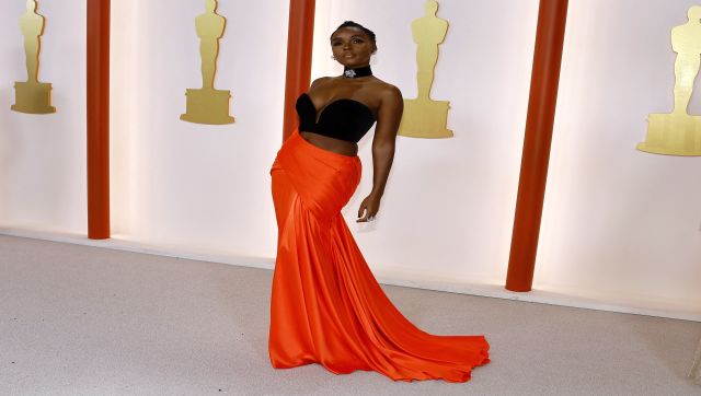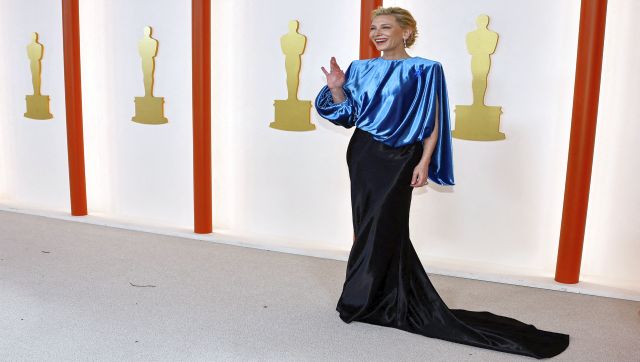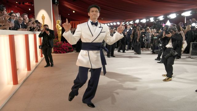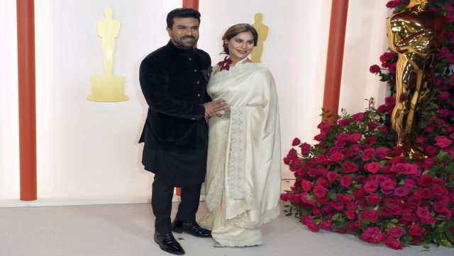 RRR actor Ram Charan brought Indian style to the Oscar carpet. He wore a black three-piece sherwani – the jacket had a bandhgala collar, padded shoulders, full-length sleeves, front gold-toned button closures, a stylish brooch and a tailored fitting, while the kurta came with a draped silhouette and an asymmetric hem. AP
