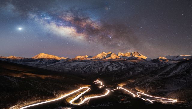 The Starry Sky Over the World’s Highest National Highway: The illuminated National Highway 219, the highest national highway in the world, snakes through the foreground, almost mirroring the majestic image of the Milky Way above. The two are separated by Kula Kangri, a mountain located in Shannan Prefecture, Tibet. Image Courtesy: Yang Sutie/Astronomy Photographer of the Year 14