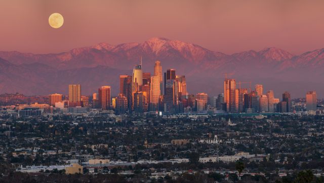 Moonrise Over Los Angeles: An alignment of the Moon, mountain and iconic skyline of Los Angeles following a winter storm on 18 December 2021. Image Courtesy: Sean Goebel/Astronomy Photographer of the Year 14