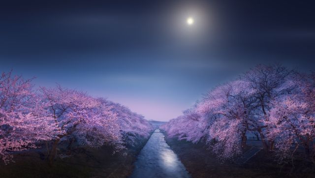 Riverside of Funakawa in Spring: When the Funakawa River was renovated in 1957, approximately 280 Yoshino cherry trees were planted on both banks of the embankment. They draw the eyeline towards the distant horizon, into an inky blue sky with only the hazy moonlight breaking through the darkness. Image Courtesy: Takanobu Kurosaki/Astronomy Photographer of the Year 14
