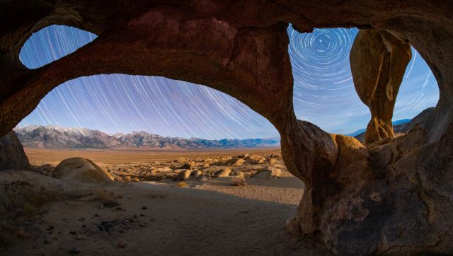 Circles and Curves: Viewed from under a quadruple arch, the stars circle around Polaris, in this stack of 33 four-minute exposures. California’s Sierra Nevada mountain range fills the horizon and Mount Whitney, the tallest peak in the continental US, is on the far left. Image Courtesy: Sean Goebel/Astronomy Photographer of the Year 14