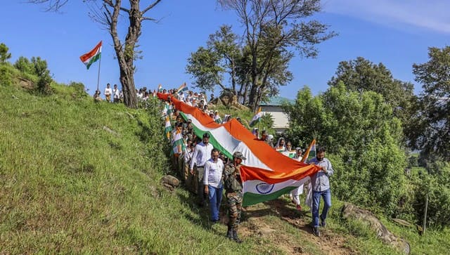 Indian Army personnel participate in a Tiranga Yatra with locals at Mendhar sector in Poonch. PTI