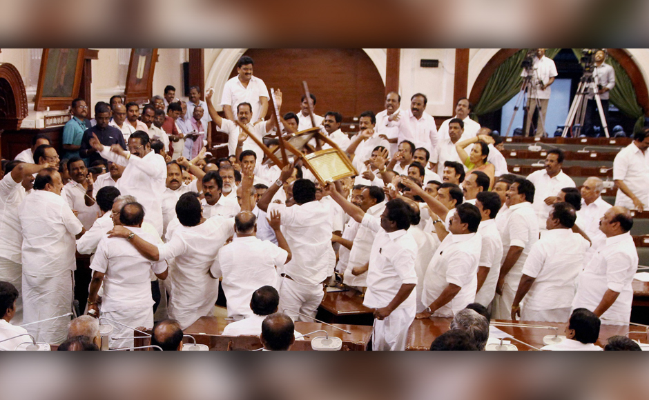 As the lawmakers supporting Chief Minister Palaniswami remained silent, the DMK legislators surrounded Speaker P Dhanapal shouting slogans. They also tore the assembly agenda papers and threw some chairs around. PTI