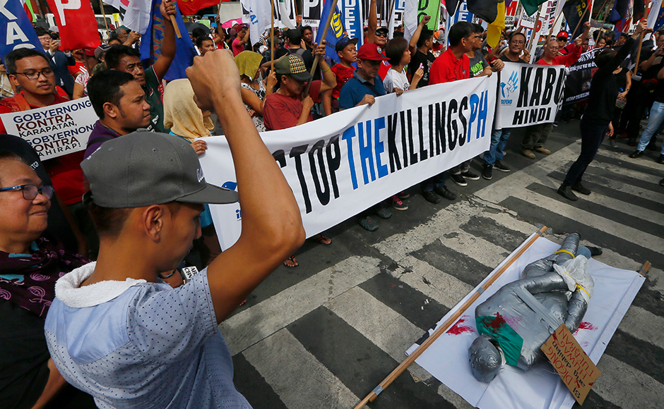 Protesters display a stuffed figure to symbolize the victims of extra-judicial killings in the country during a rally near the Presidential Palace to mark International Human Rights Day Saturday, 10 December, 2016 in Manila, Philippines. AP