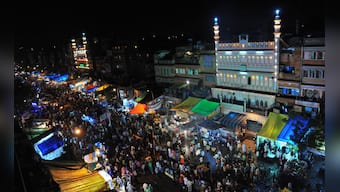 Jaipur: Masjid and shop's decorated with lights on the eve of Eid festival in Jaipur on Monday. PTI
