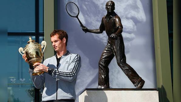 Tennis player Andy Murray holds the trophy under a statue of former British champion Fred Perry, at Wimbledon, southwest London. Murray became the first British man since Fred Perry in 1936 to win the men’s title at Wimbledon with a stunning 6-4 7-5 6-4 victory over world number one Novak Djokovic on Sunday. Chris Helgren/Reuters
