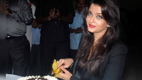 Aishwarya Rai Bachchan poses for the cameras as she cuts her birthday cake in the presence of media persons at the family home Jalsa on Saturday. Sachin Gokhale/ Firstpost
