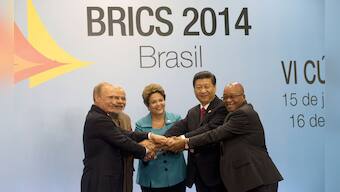 Russia's President Vladimir Putin, left, India’s Prime Minister Narendra Modi, second left, and South African President Jacob Zuma, center back to camera, greet each other, while Brazil’s President Dilma Rousseff, right wearing green, takes a seat during the BRICS 2014 summit in Fortaleza, Brazil. Silvia Izquierdo/AP