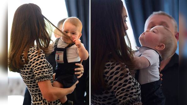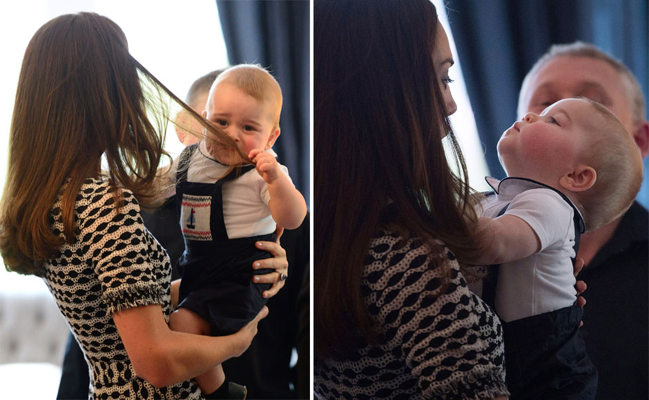 Britain’s Prince George plays with his mother Catherine, the Duchess of Cambridge’s hair, during a Plunket play group event at Government House in Wellington. REUTERS