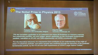 A picture Francois Englert of Belgium and Britain's Peter Higgs, laureates of the 2013 Nobel Prize in Physics, are displayed on a screen during a news conference at the Royal Swedish Academy of Sciences in Stockholm 8 October, 2013. Higgs and Englert won the Nobel Prize for physics on Tuesday for predicting the existence of the Higgs boson particle that explains how elementary matter attained the mass to form stars and planets. Erik Martensson/TT News Agency/Reuters