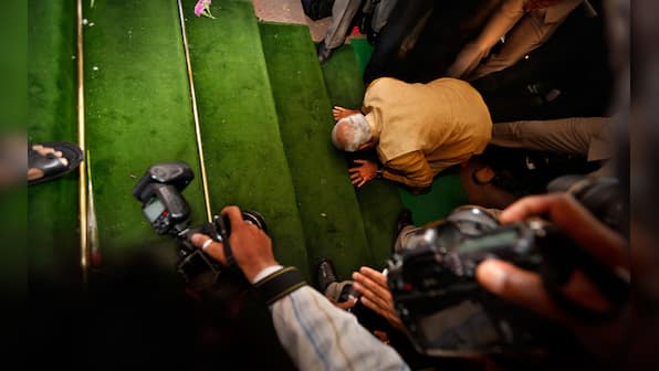 Photos: He stoops to conquer? Modi prays before Parliament stairs